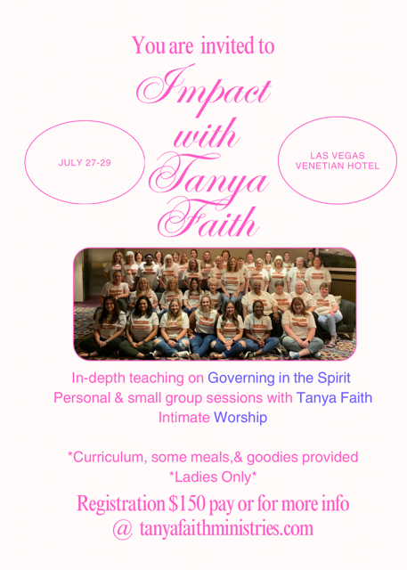 Join Tanya Faith in sunny Las Vegas, July 27-29th. Pastor Tanya will be hosting ladies from across the country for this exciting event, with a focus on “governing in the spirit”.